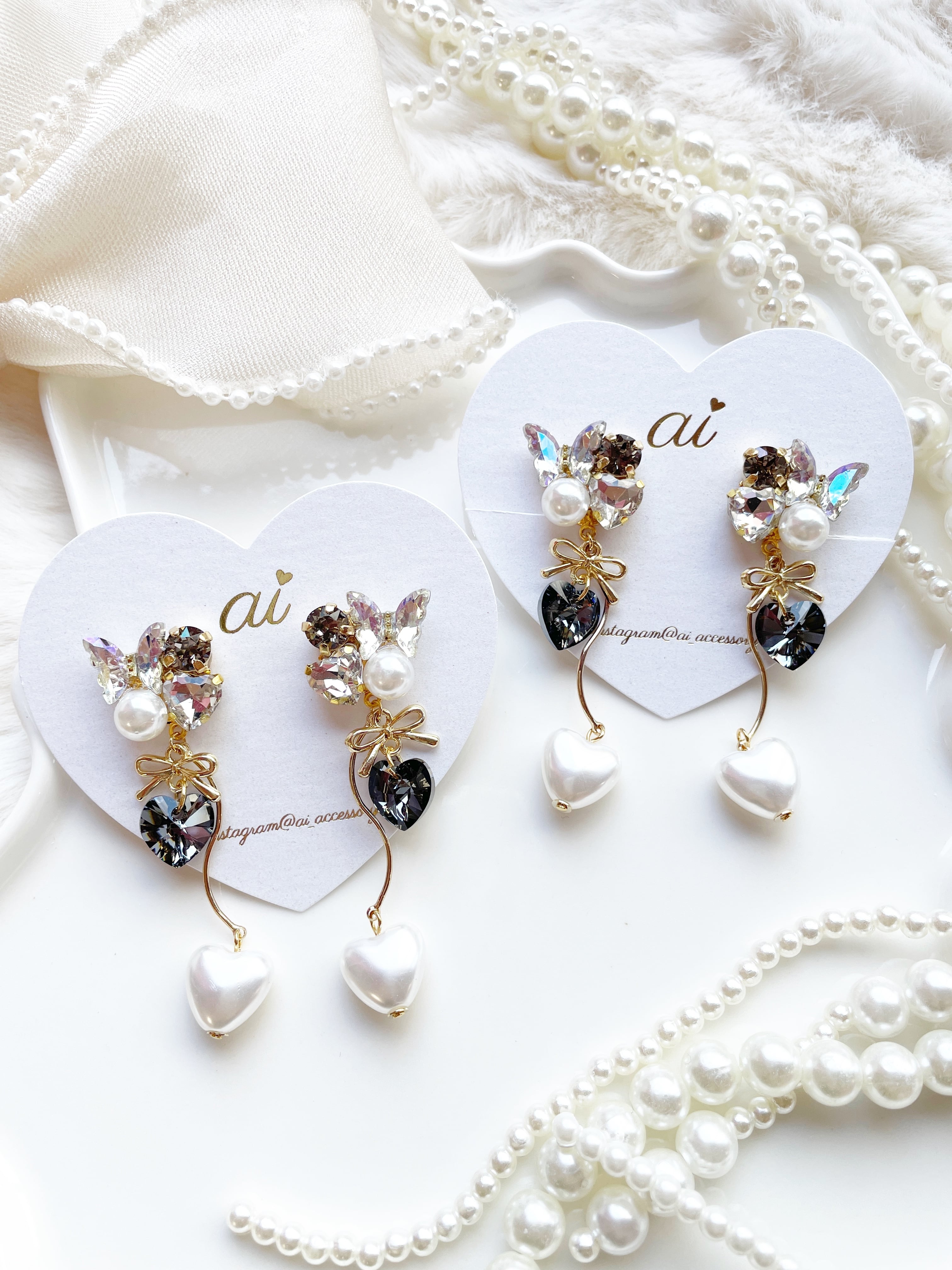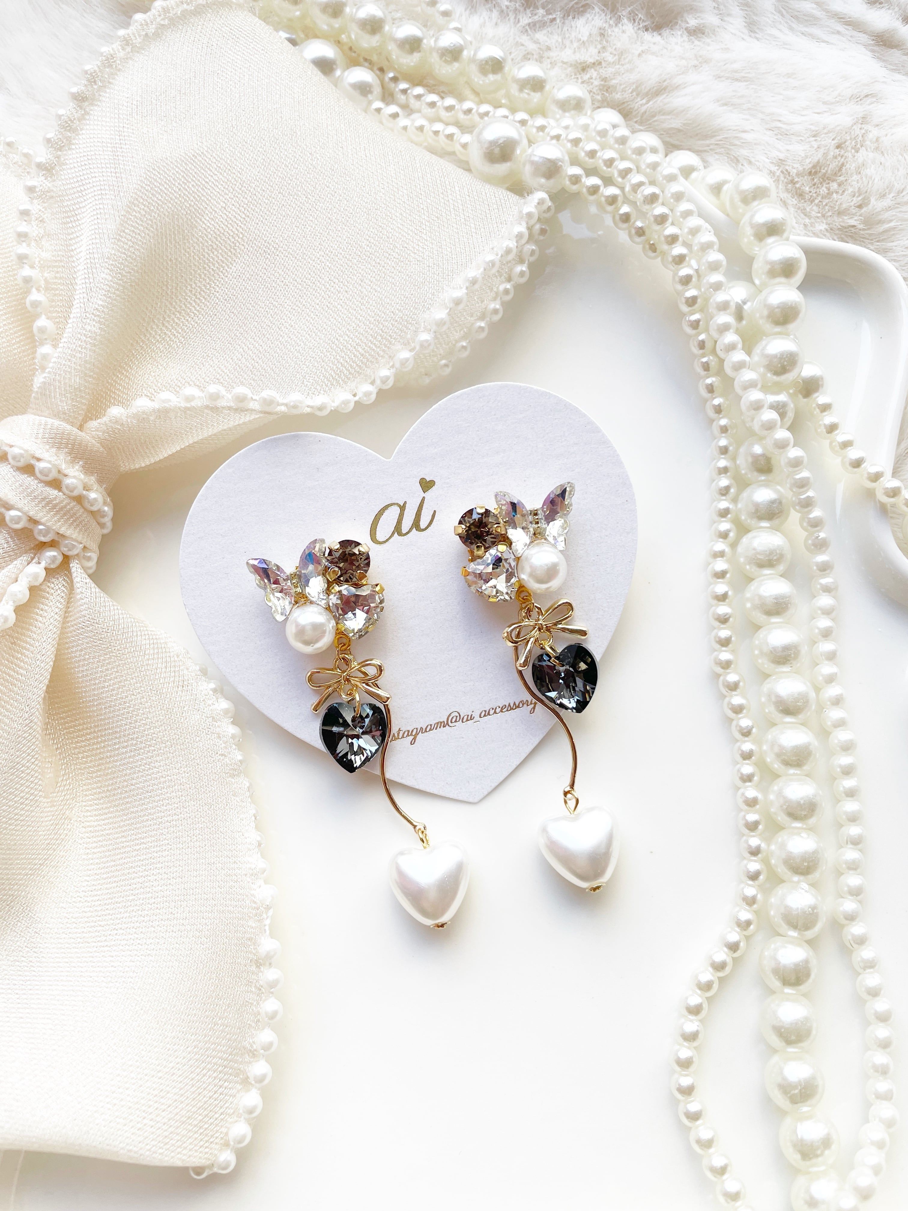 キラキラのスワロフスキービジュー・スワロフスキーハートを使用しふんわり揺れるパールハートが上品で、大人かわいい印象に仕上げました♡